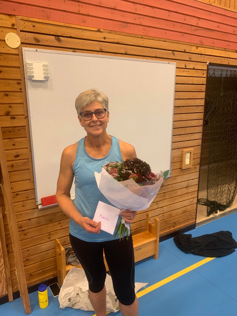 Efter att ha lett Äsperedsbor (och många andra) i 27 år i att hoppa och stretcha som värsta Susanne Lanefelt har nu vår Marita Floberg Persson valt att lämna över platsen i mitten till två efterträdare och ställa sig ute i cirkeln istället. Vi i Äspereds IF vill visa vår tacksamhet för att ha ställt upp som ledare under alla dessa år med att överräcka en blomma.